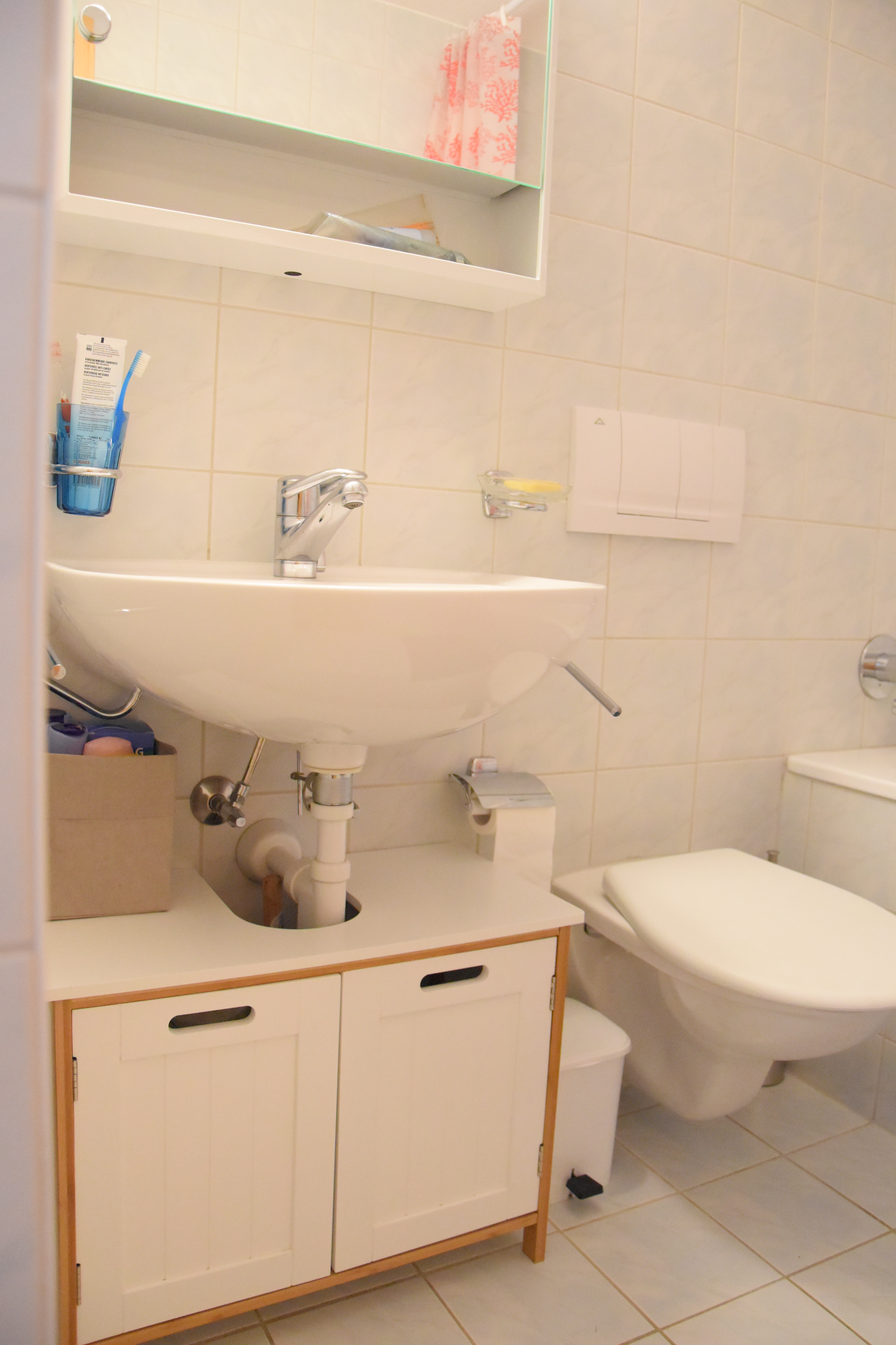 Das Bad (Foto siehe unten) bietet ein Lavabo, Badewanne und Toilette. Ein Haartrockner ist vorhanden.
