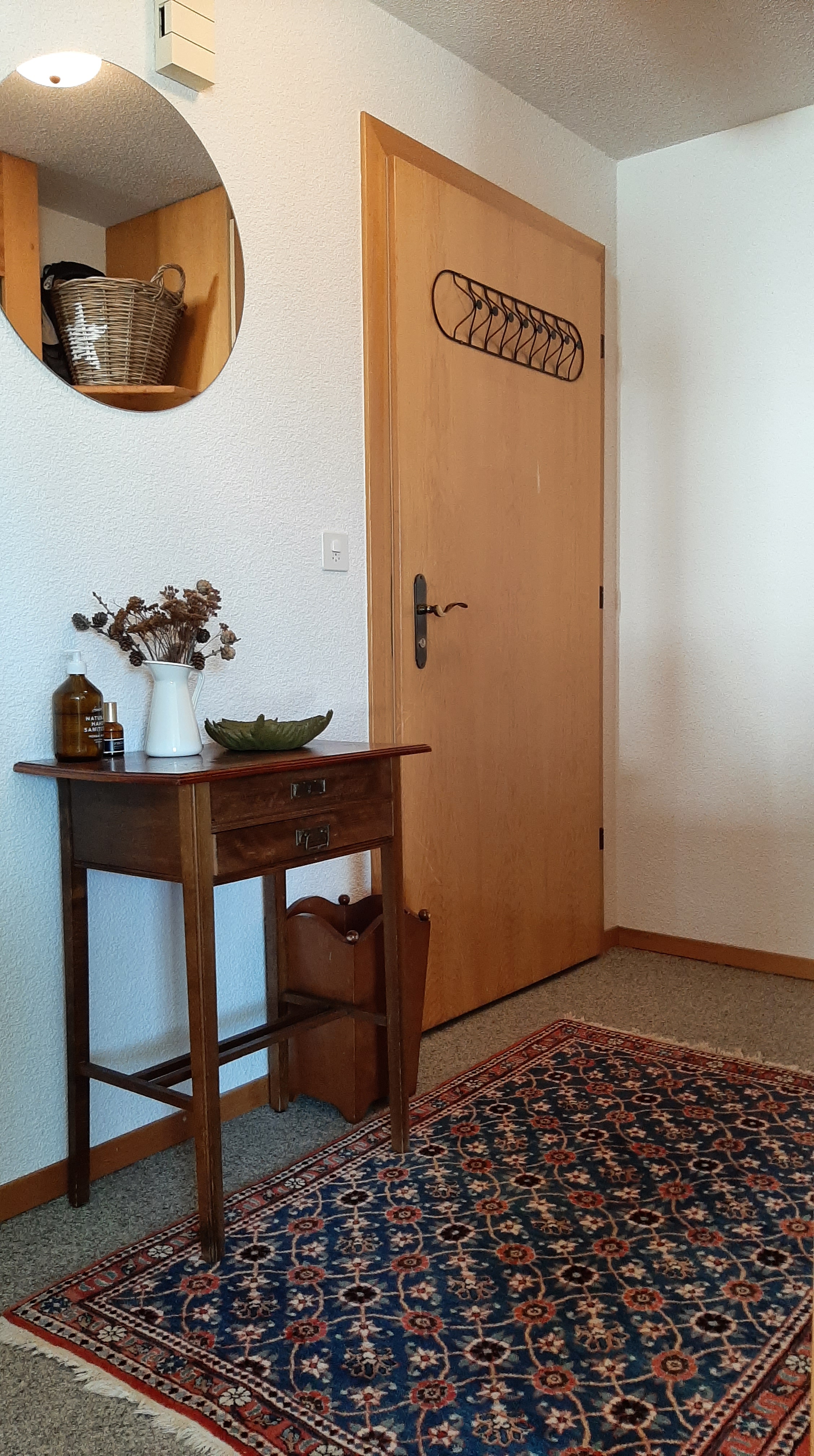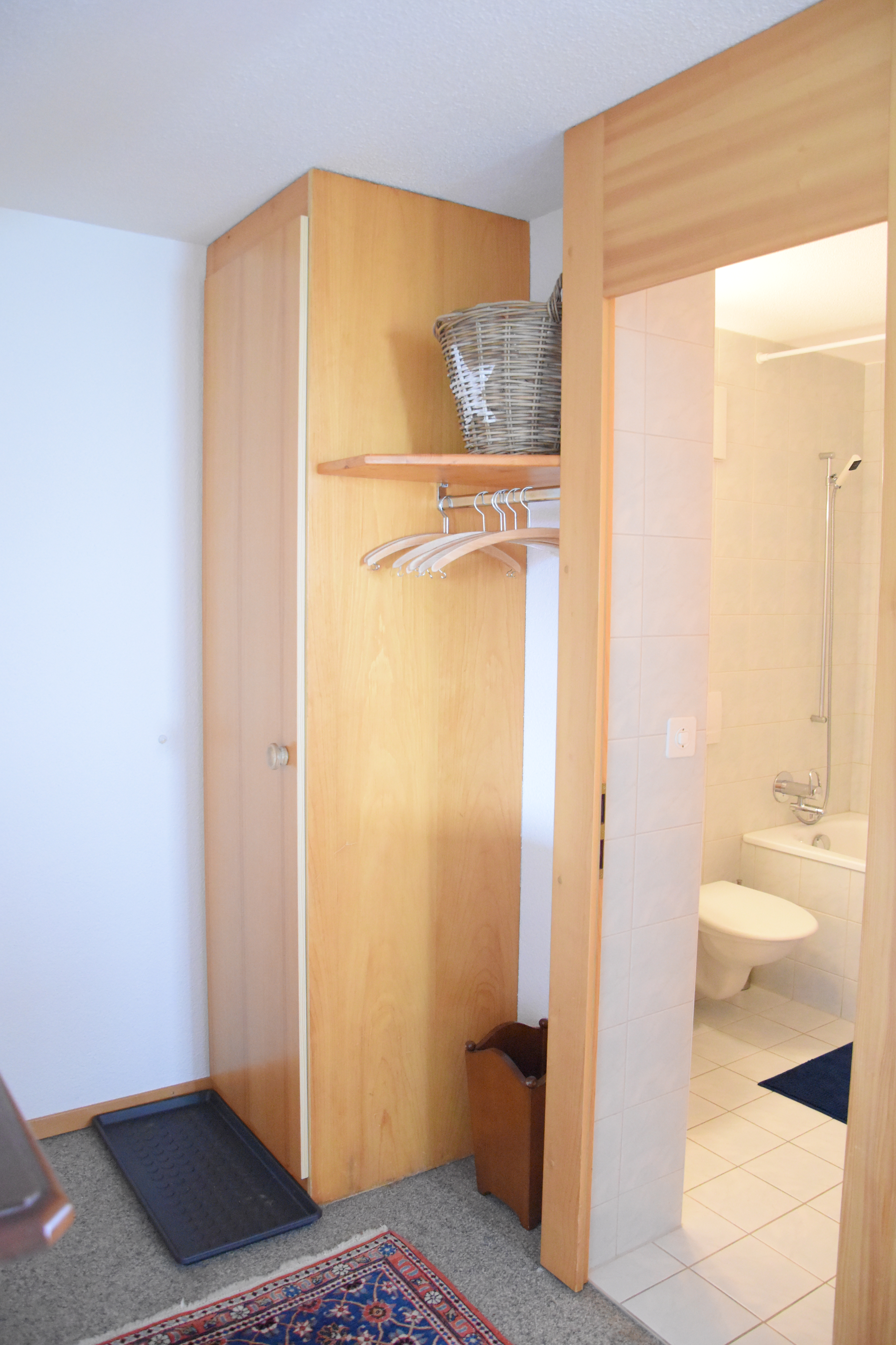 Wir haben gleich beim Eingang eine kleine Garderobe/Ablage. Die Skischuhe können entweder in der Wohnung auf den dafür vorgesehenen Plastikschalen deponiert werden, oder auf dem Skitrockner im 2. Stock des Treppenhauses.