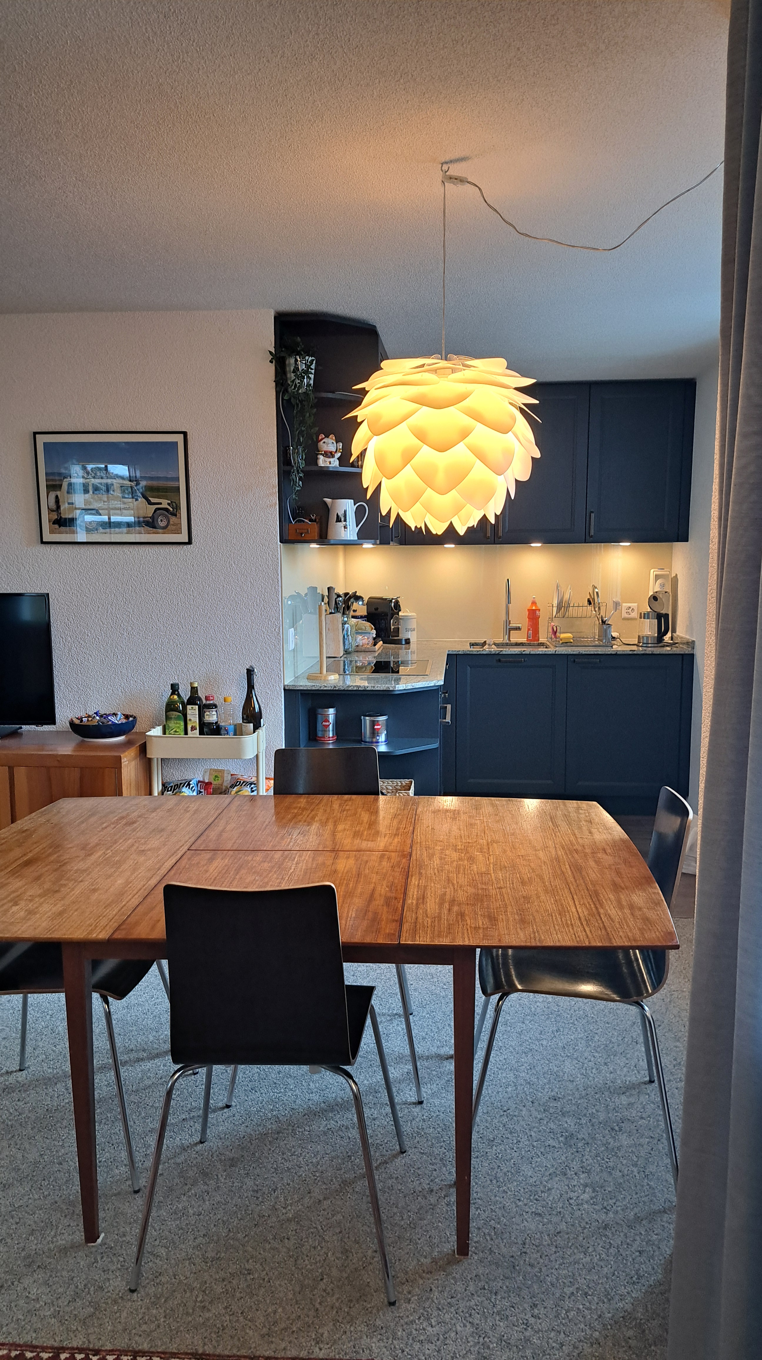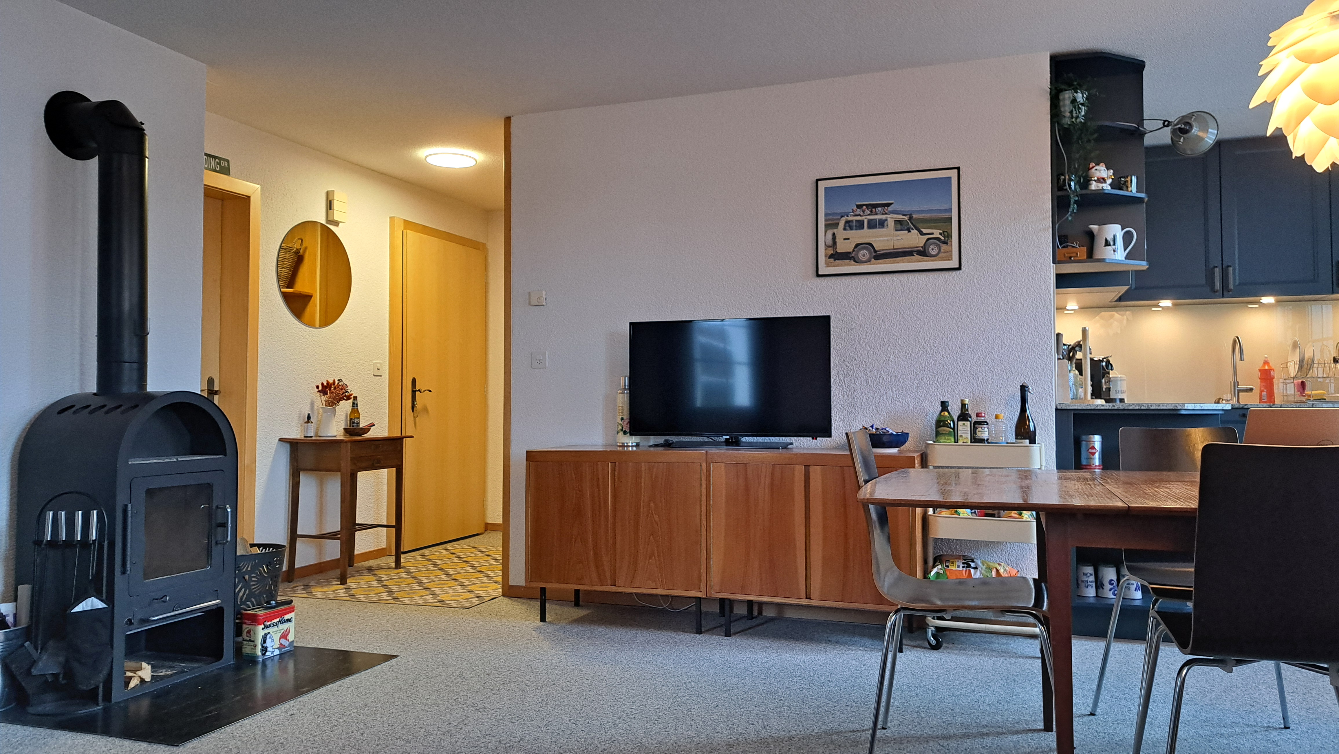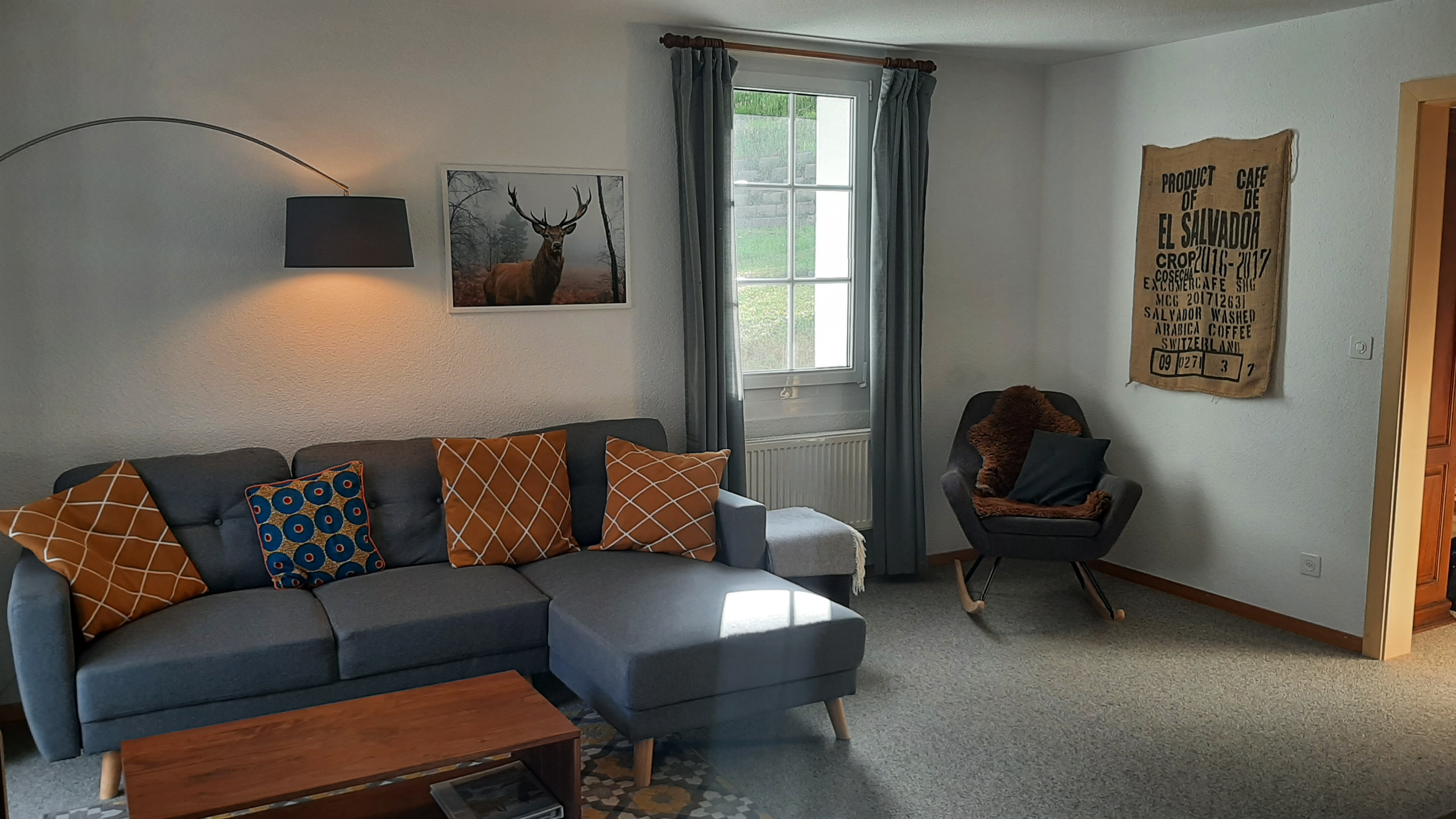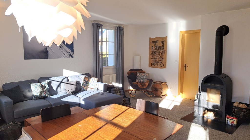 Der grösste Raum ist das kombinierte Wohnzimmer mit der offenen Küche, welche 2024 renoviert wurde. Das Wohnzimmer ist mit einem grossen, bequemen Sofa, einem Couchtisch, einem Flat-Screen-TV mit Sat-Empfang, einem Esstisch (ausziehbar) 4 Stühlen und einem Tripptrapp eingerichtet. Für warme und gemütliche Stunden sorgt ein Schwedenofen. In der Küche findet man alles, was man braucht. Wir haben einen Induktionsherd, bei dem die Herdplatten über manuelle, versenkbare Knöpfe bedient werden. Der Backofen wird mit dem Front-Menü (Touchscreen) bedient. Zwei Fondue-Caquelons (1x für Induktion und ein Keramik-Caquelon für die sep. Herdplatte), ein Raclette-Öfeli, ein Toaster, Wasserkocher, eine sep. Kochplatte und eine Nespresso-Maschine mit Milchschäumer sind ebenfalls vorhanden. Ausserdem ist Geschirr für 5 Personen vorhanden.