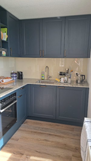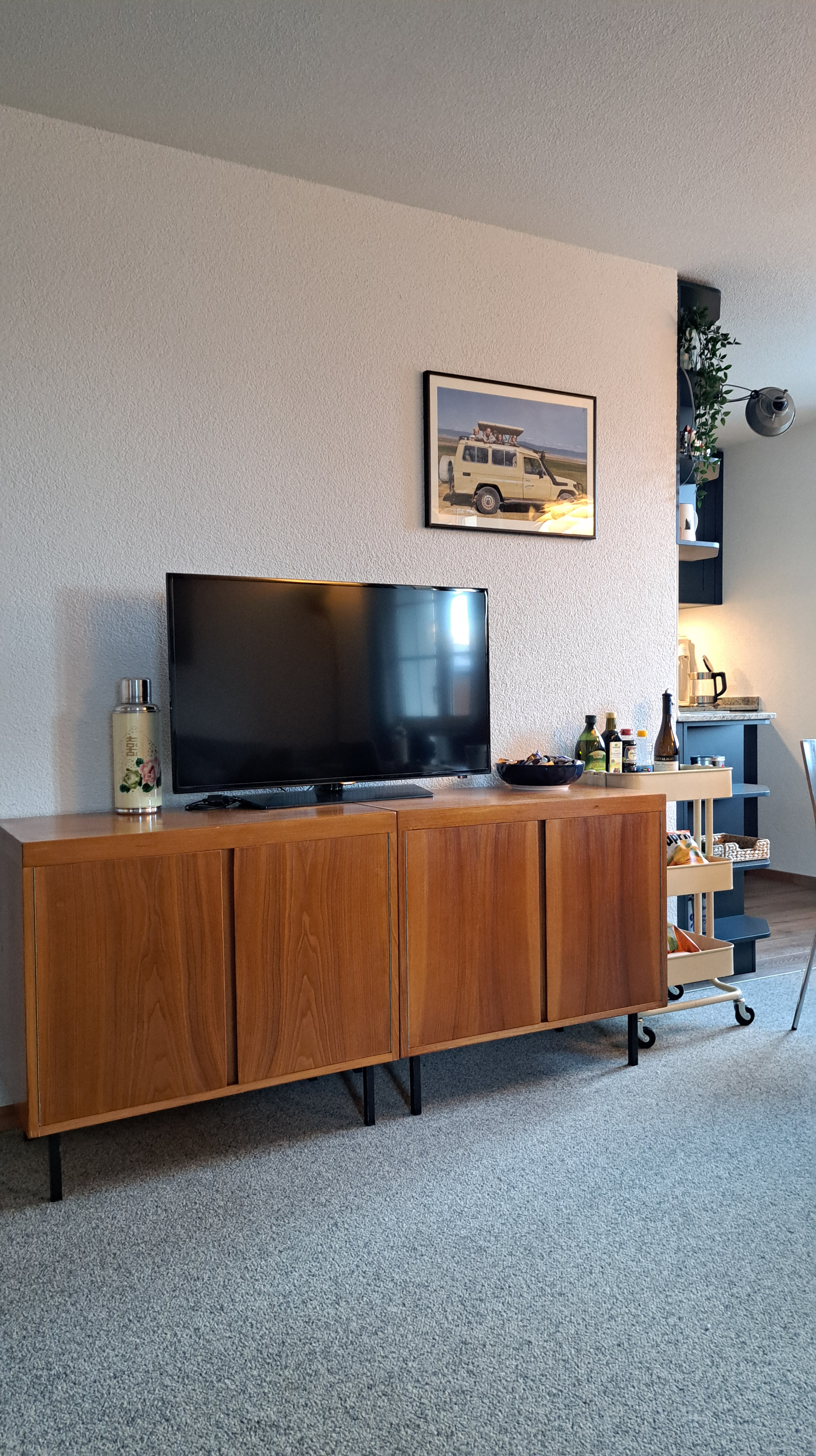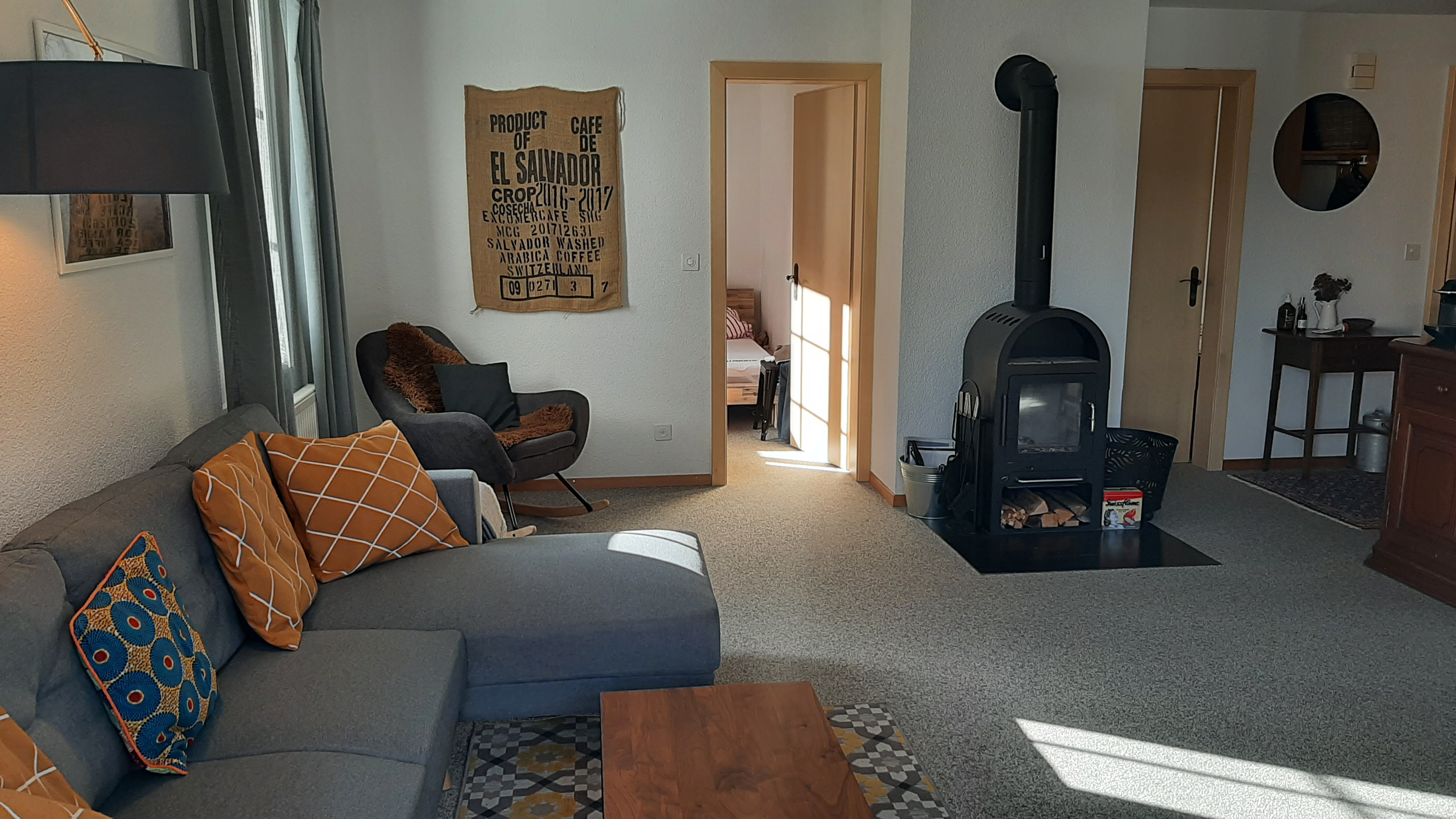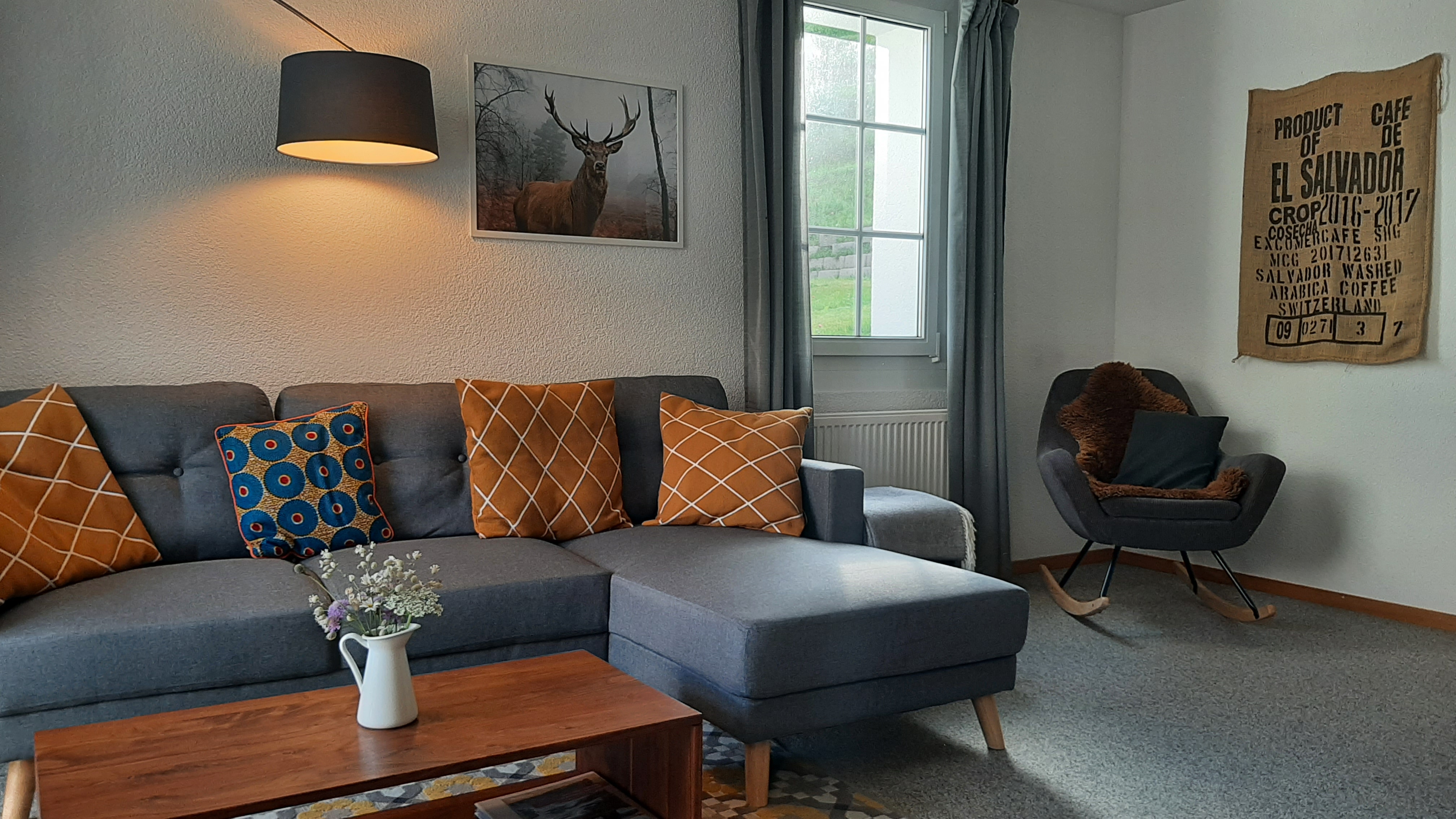 Der grösste Raum ist das kombinierte Wohnzimmer mit der offenen Küche, welche 2024 renoviert wurde. Das Wohnzimmer ist mit einem grossen, bequemen Sofa, einem Couchtisch, einem Flat-Screen-TV mit Sat-Empfang, einem Esstisch (ausziehbar) 4 Stühlen und einem Tripptrapp eingerichtet. Für warme und gemütliche Stunden sorgt ein Schwedenofen. In der Küche findet man alles, was man braucht. Wir haben einen Induktionsherd, bei dem die Herdplatten über manuelle, versenkbare Knöpfe bedient werden. Der Backofen wird mit dem Front-Menü (Touchscreen) bedient. Zwei Fondue-Caquelons (1x für Induktion und ein Keramik-Caquelon für die sep. Herdplatte), ein Raclette-Öfeli, ein Toaster, Wasserkocher, eine sep. Kochplatte und eine Nespresso-Maschine mit Milchschäumer sind ebenfalls vorhanden. Ausserdem ist Geschirr für 5 Personen vorhanden.