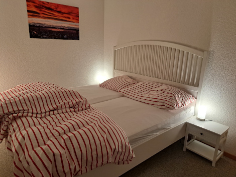Das Elternschlafzimmer besteht aus einem grossen Bett (2 Matratzen à 90cm) und einem Schrank. Wir haben zwei Daunendecken mit den Massen 120cm x 200cm und neue Kopfkissen/Pfulmen mit den Massen 100cm x 65cm.