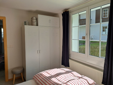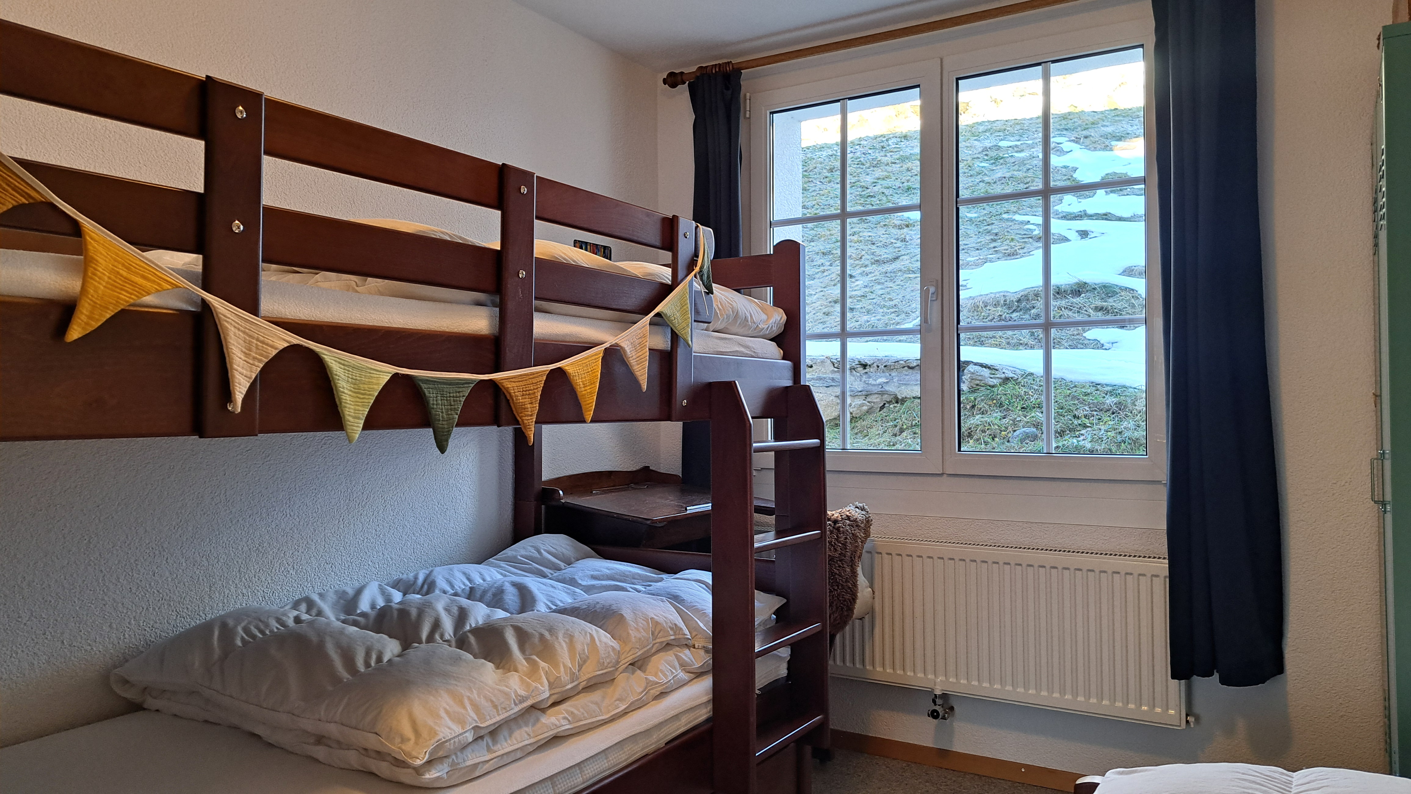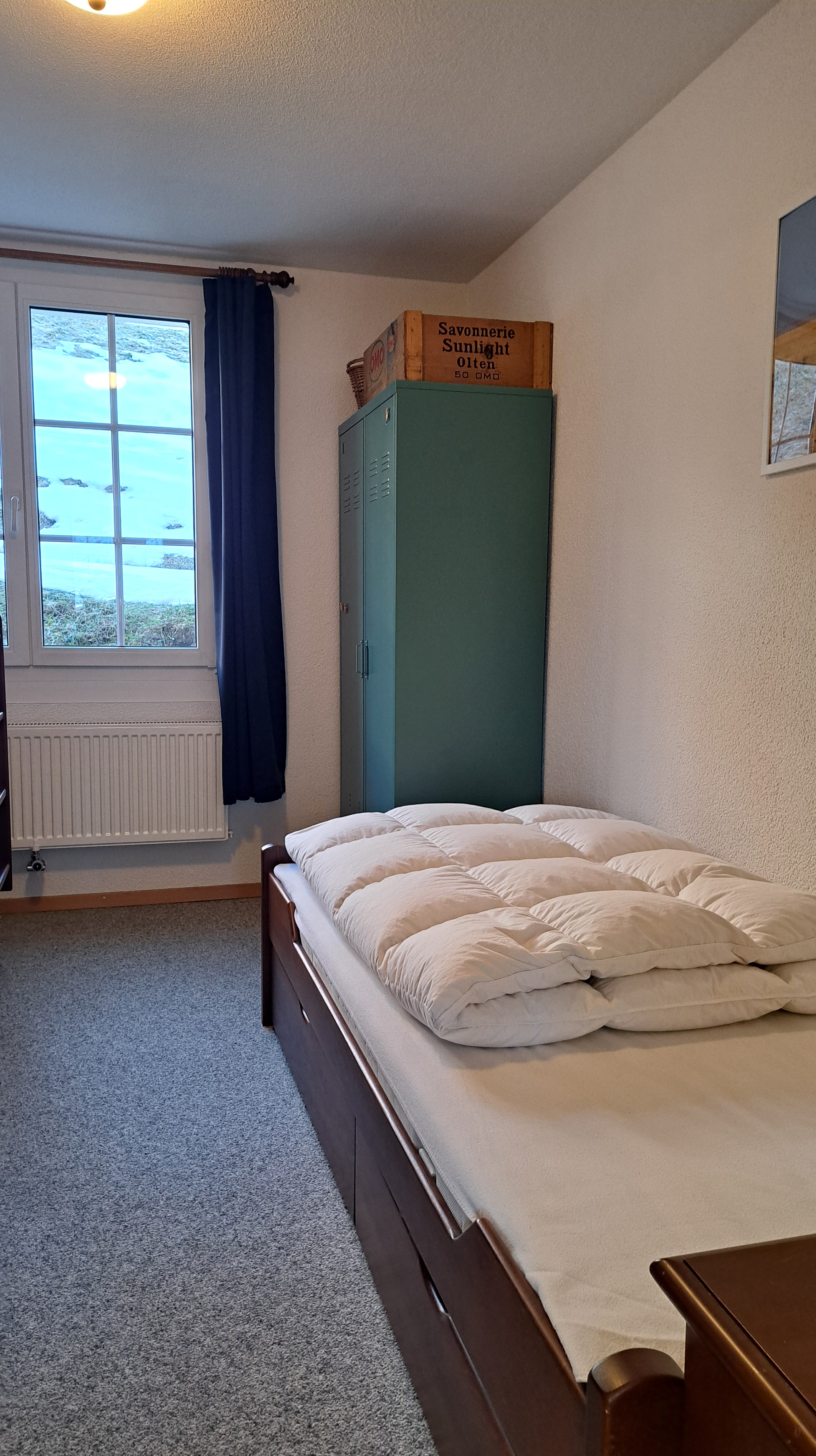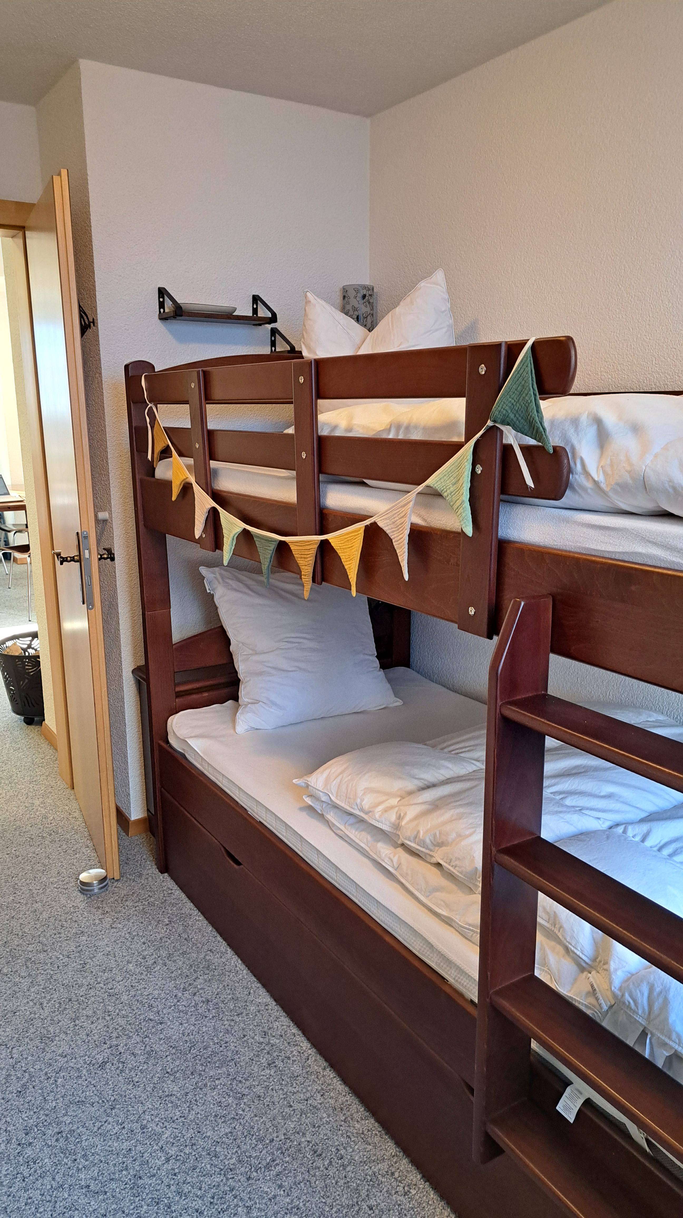 Das Kinderzimmer ist mit einem Kajütenbett und einem Einzelbett, sowie einem grossen Schrank eingerichtet. Wir haben unter dem Kajütenbett Legos, eine grosse Briobahn und Quadrilla Kugelbahn verstaut. Die Daunendecken haben die Masse: 120cm x 200cm; die Kopfkissen haben die Grösse 65cm x 65cm.